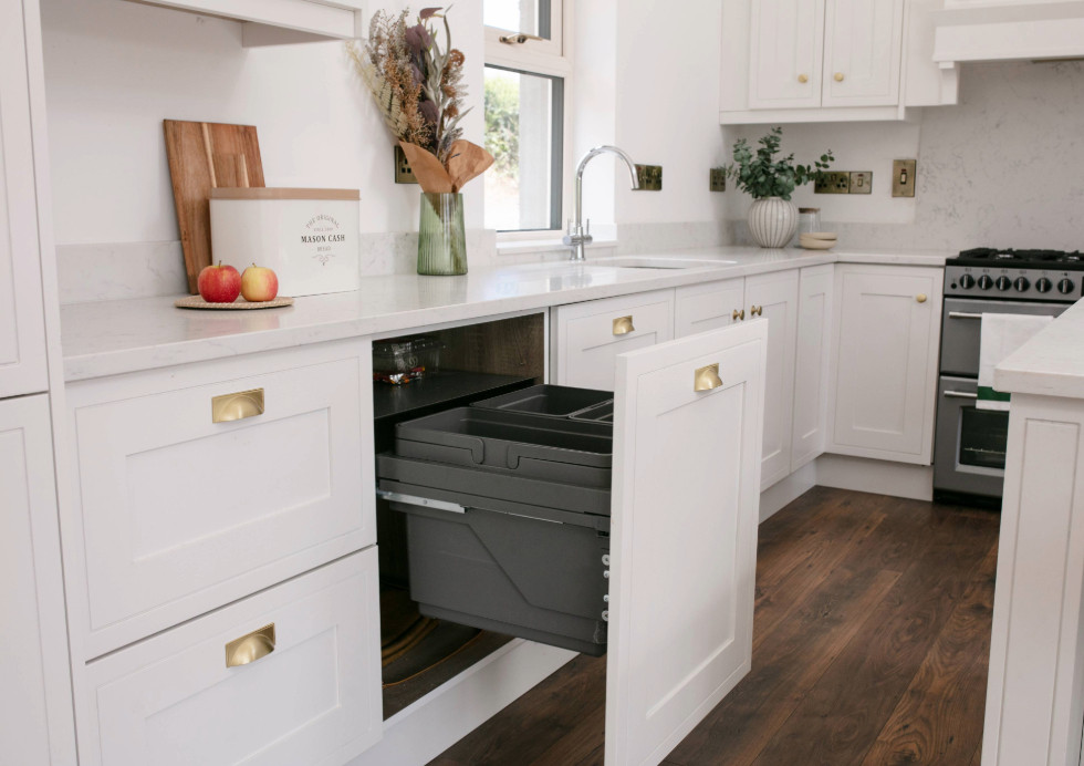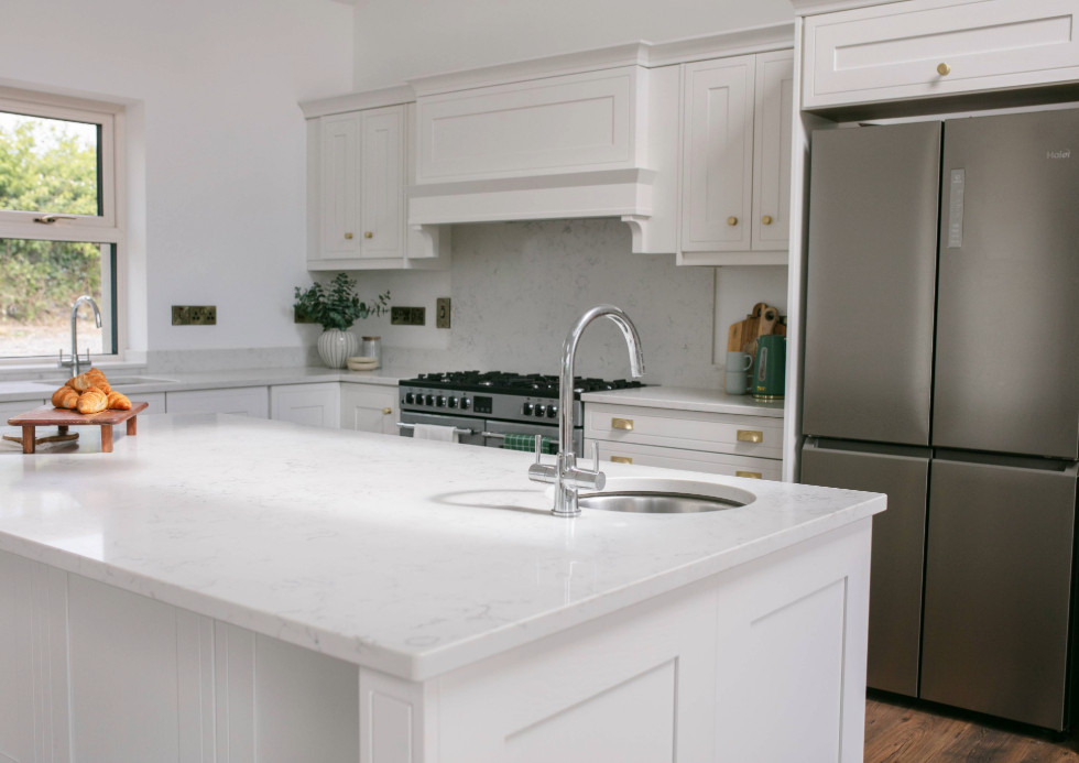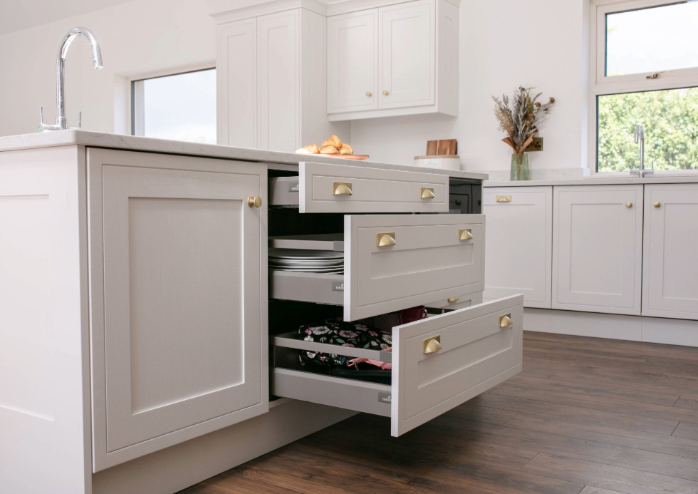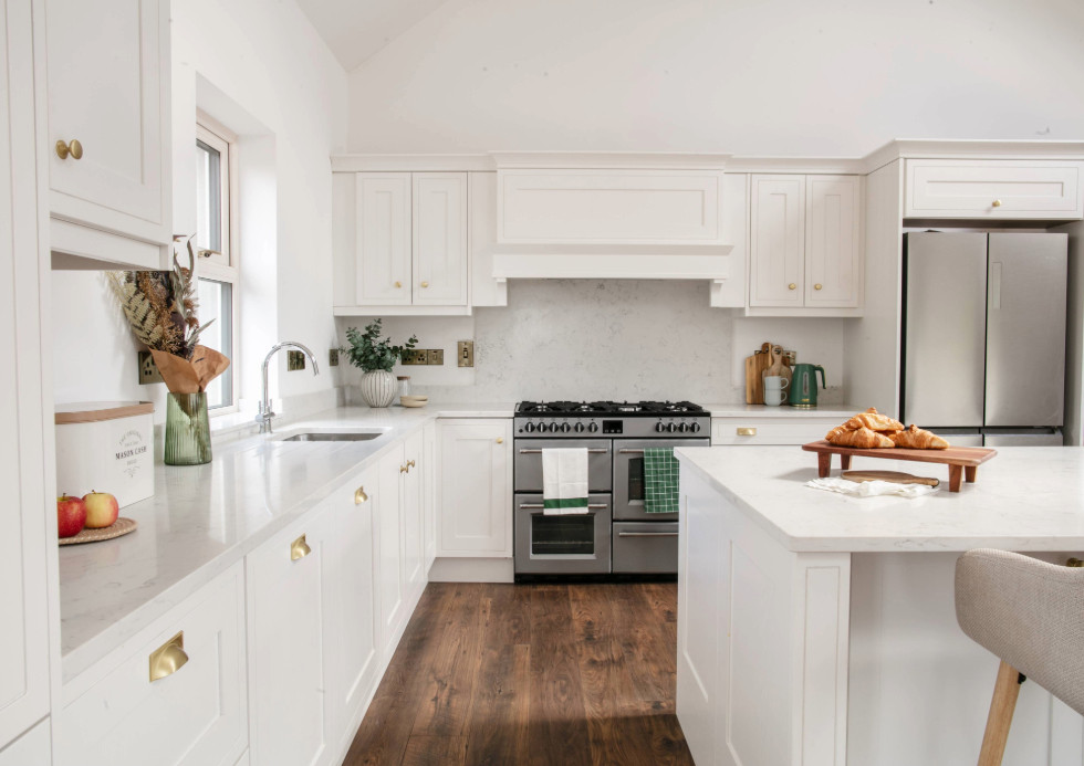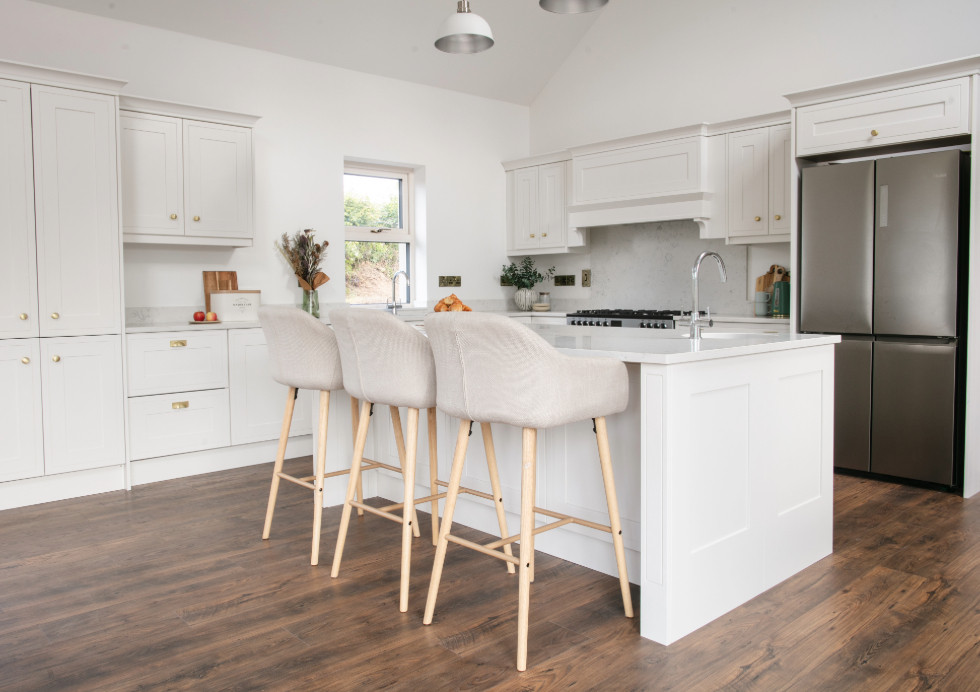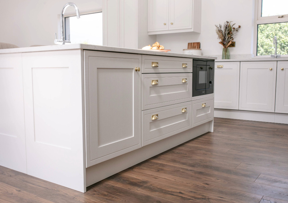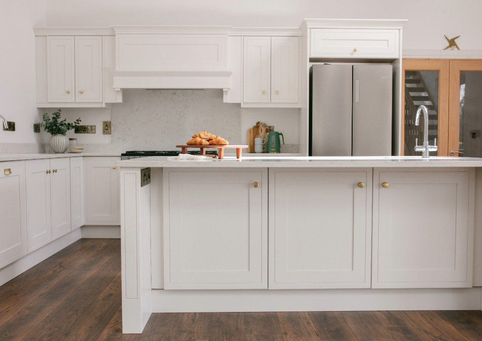 Claire explains why she went with the Hampton Cotton White kitchen with island: "It gives a classic, but fresh feel to the place". The Hampton has in-frame solid ash framed doors, perfectly meeting Claire's requirements for a good quality kitchen that would last years.