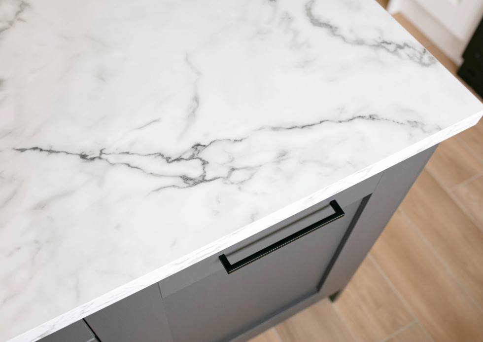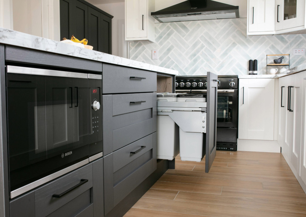 Naomi tells us that she chose the Augusta door-style because it has clean lines without feeling cold. It also wasn't too traditional or ornate. She opted for white units and added graphite on the island to bring some contrast and a little bit of drama. The look is completed by black handles and a Calcutta Marble effect worktop. "I love that the worktop has a glossy finish", says Naomi. "People are always surprised when we tell them it's laminate".