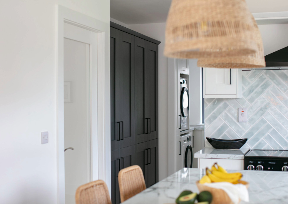 Naomi and Brian decided to add a utility room off the kitchen in Augusta White to keep within the aesthetic of the kitchen.They opted for stacked appliances and a sink to optimise the space.