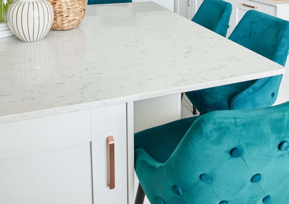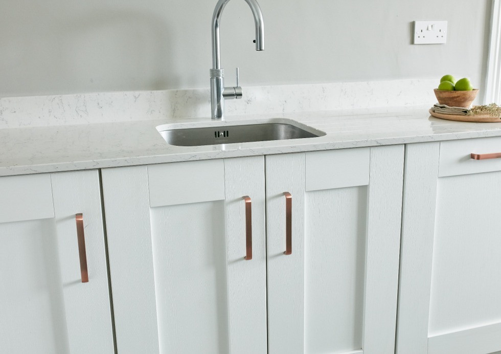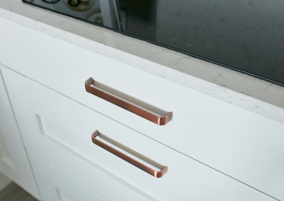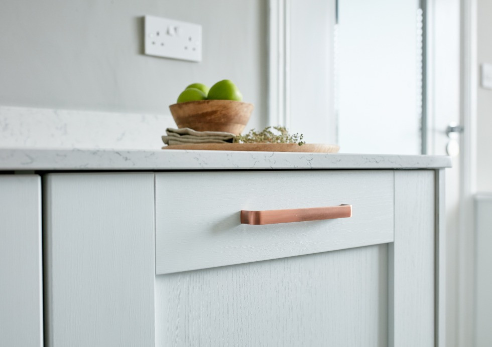 Copper handles paired with a quartz worktop