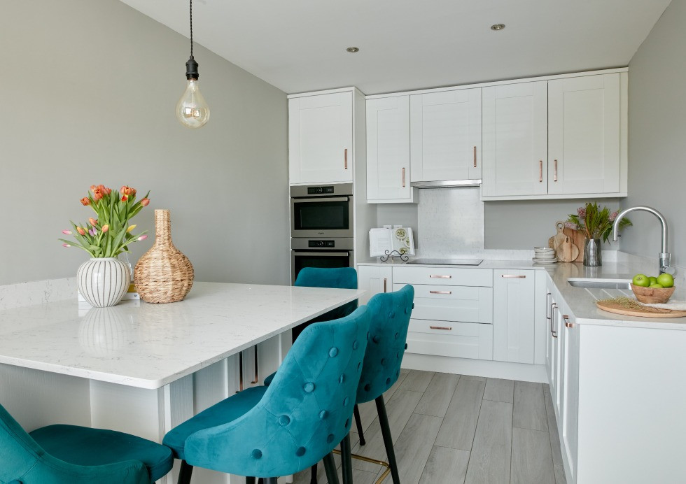 "The copper handles and chrome Quooker tap added a modern twist to my kitchen. I chose ocean white 20mm quartz as my worktop and splashback. Choosing quartz allowed me to have under-mounted sink and drainer groves which gave me the maximum amount of workspace on my countertop. I chose the Whirlpool 60cm induction hob, eye level oven and combi microwave. The sixth sense feature on the Whirlpool appliances has changed how I cook. It is a simple-to-use feature that produces perfect results.